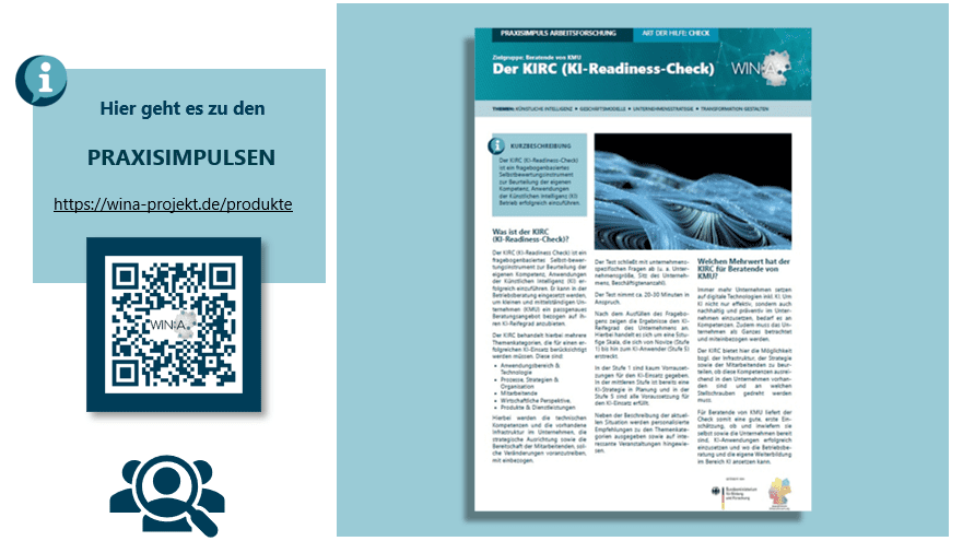 Die Praxisimpulse Arbeitsforschung sind ein Produkt des Projektes WIN:A, das vom Bundesministerium für Bildung und Forschung (BMBF) gefördert wird. Die Praxisimpulse können kostenlos heruntergeladen werden. Derzeit stehen 22 Praxisimpulse zum Download zur Verfügung. Es werden monatlich mehrere neue Praxisimpulse erarbeitet und bereitgestellt.