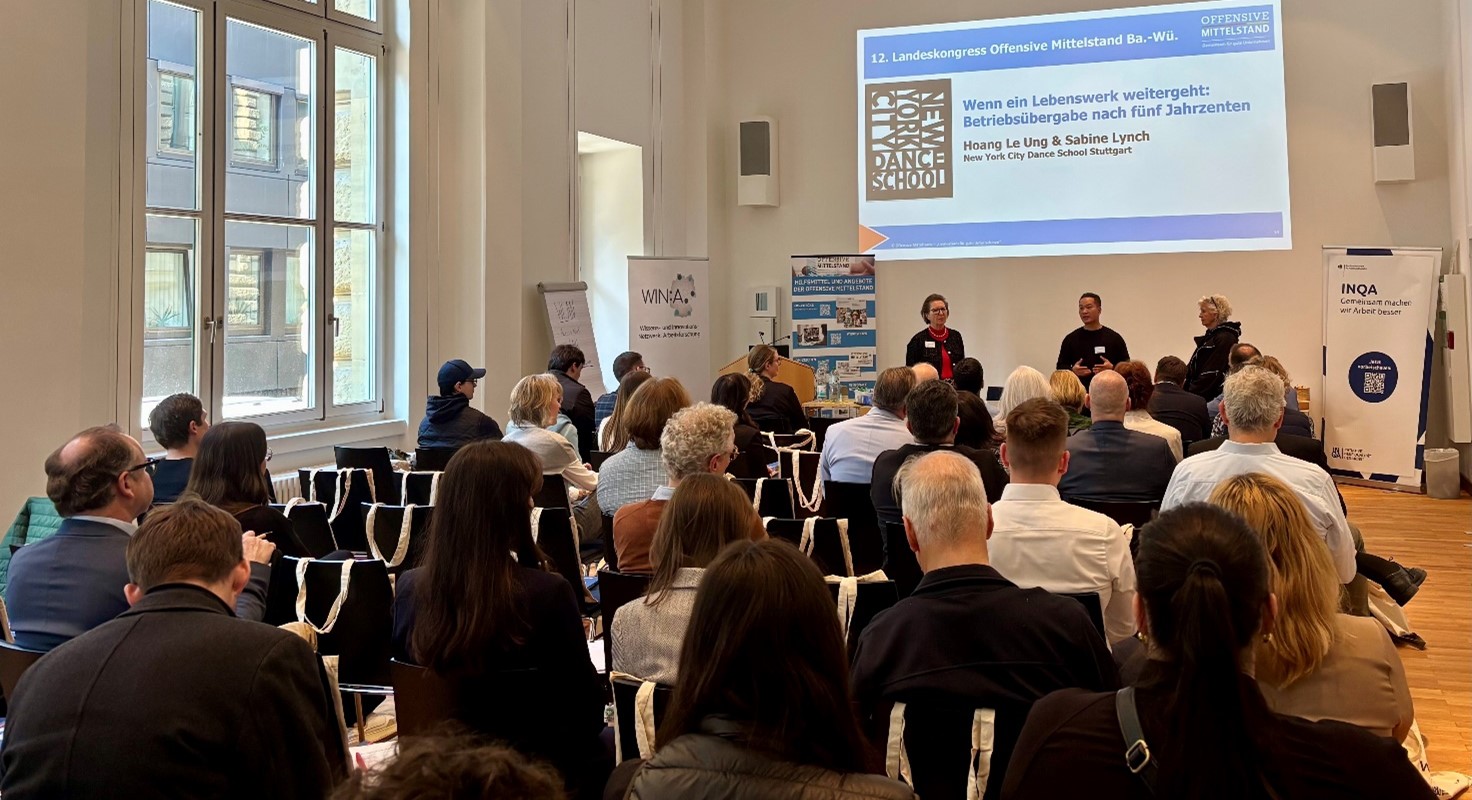 Unter dem Motto „Übergeben, übernehmen, umsetzen: Wissensbasierte Zukunftsgestaltung in KMU“ fand der 12. Landeskongress der Offensive Mittelstand Baden-Württemberg im Haus der Wirtschaft in Stuttgart mit rund 80 Teilnehmenden aus Wirtschaft, Beratung, Wissenschaft und Intermediären statt.
